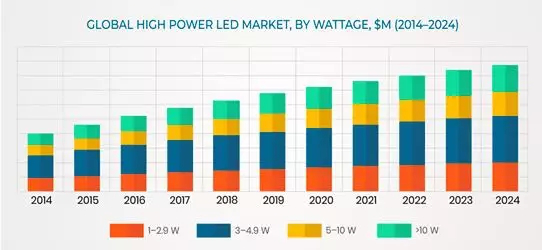 根據功率,大功率LED市場(chǎng)分為1-2.9W,3-4.9W,5-10W和> 10W。其中,由于5-10W大功率LED在室外照明和娛樂(lè )照明等一般照明應用中的部署不斷增加,因此預計5-10W類(lèi)別的增長(cháng)最快。
